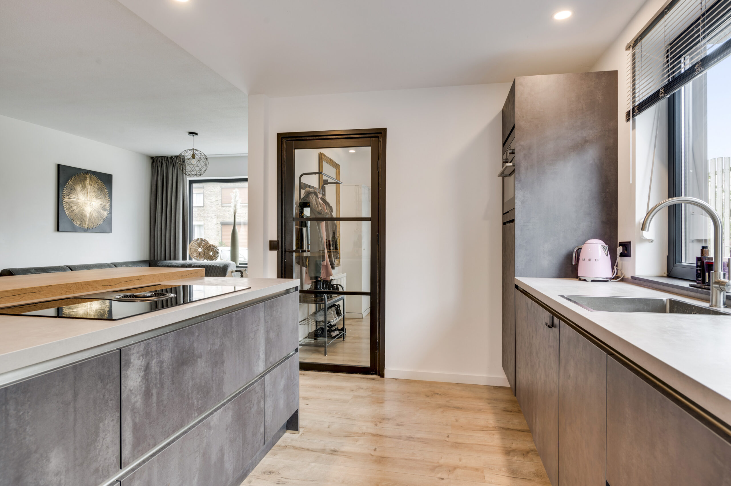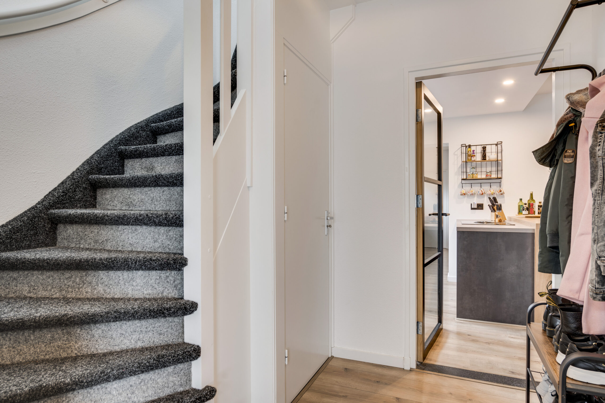 de hal met meterkast (slimme meter, 8 groepen, een kookgroep en 2x aardlek) biedt toegang tot de eerste verdieping, het woongedeelte, de kelder en het toilet.