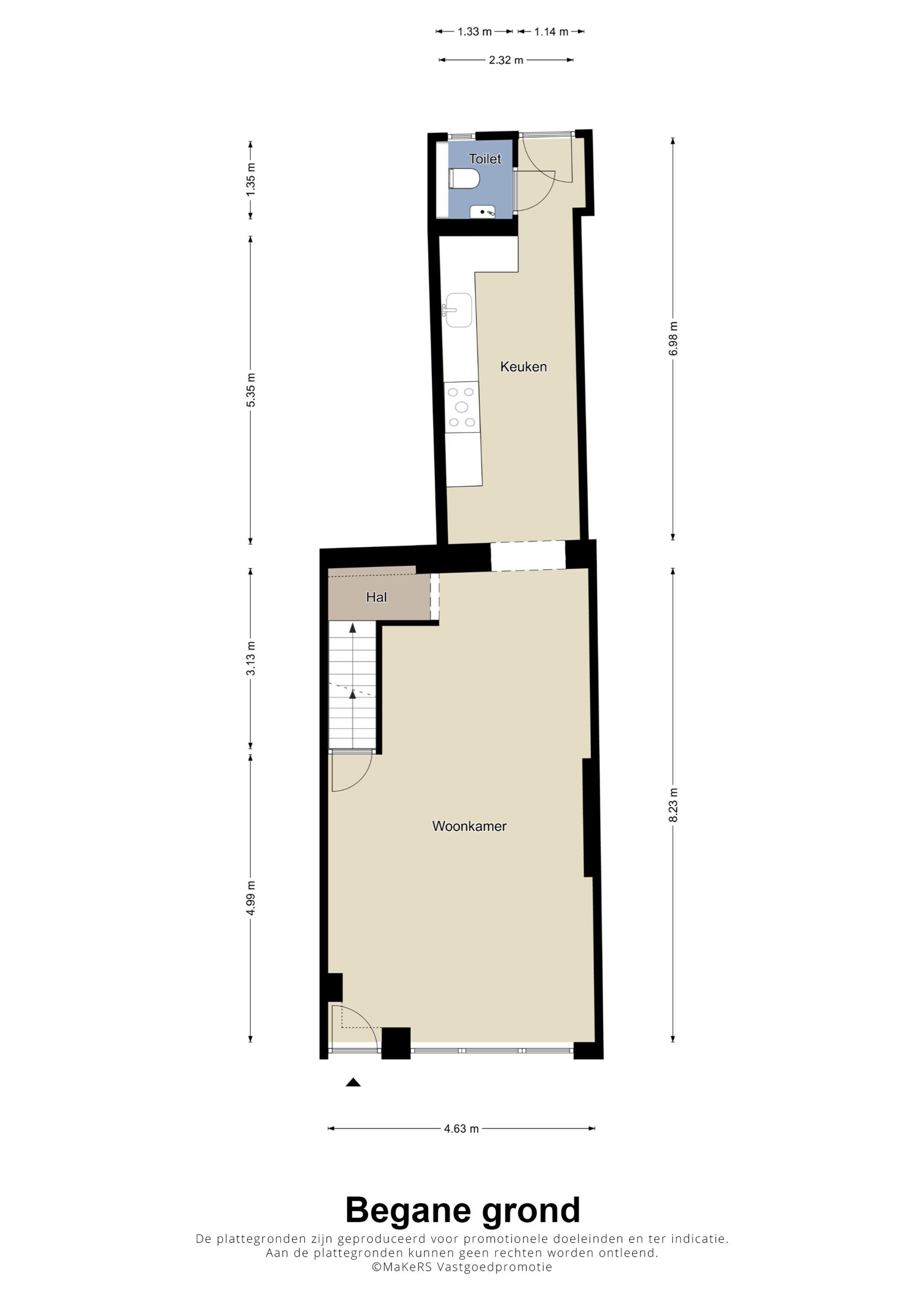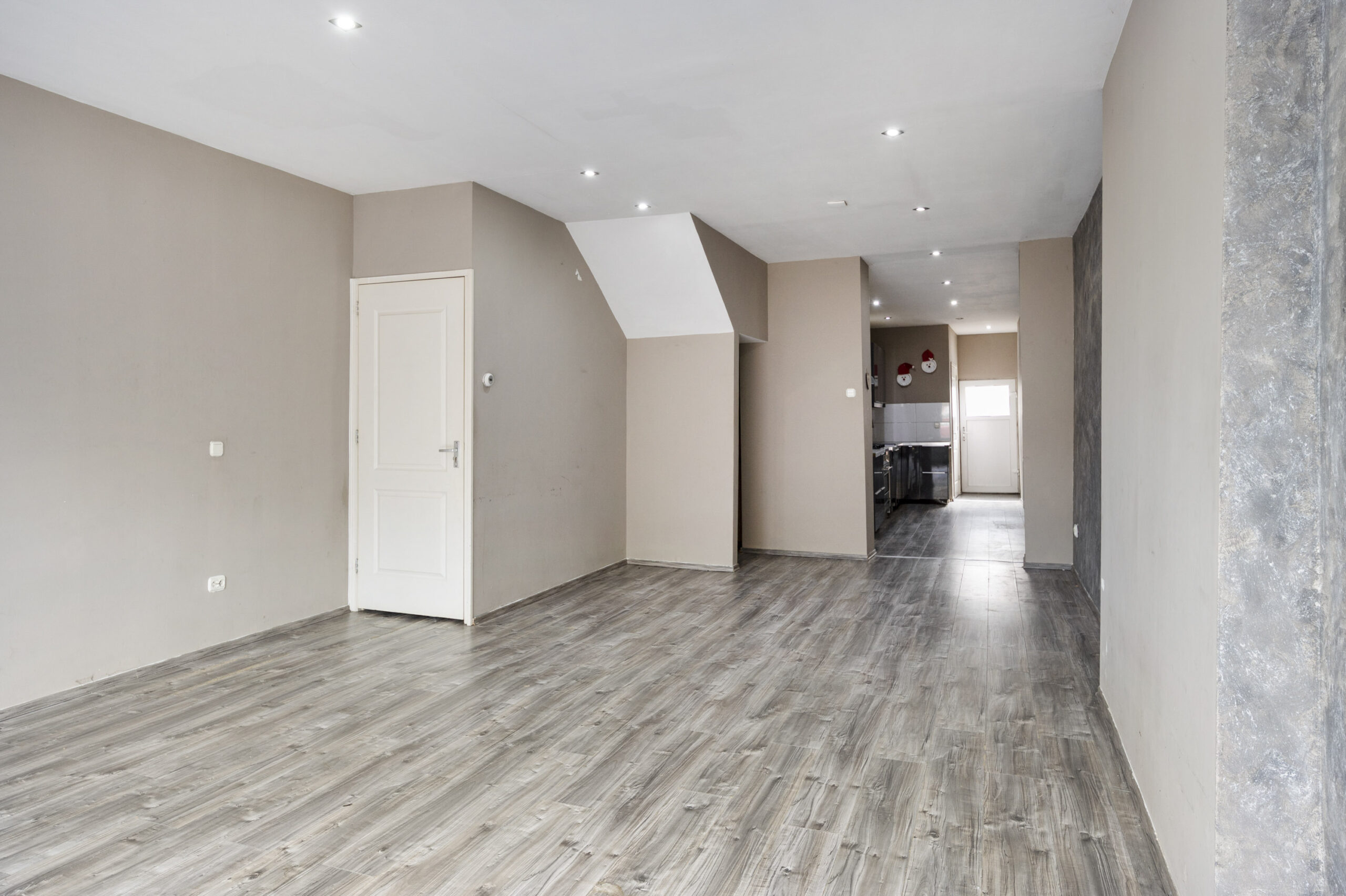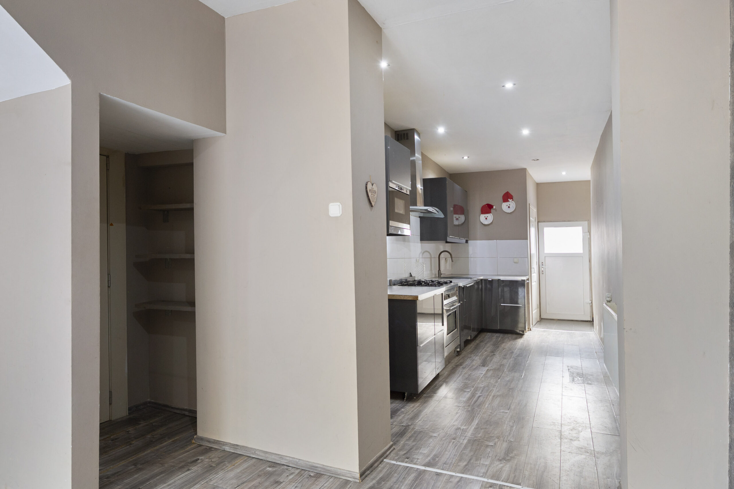 de hal met meterkast (slimme meter, 4 groepen en 1x aardlek) biedt toegang tot de voorgelegen het woongedeelte bestaande uit de woonkamer, de keuken en het toilet.