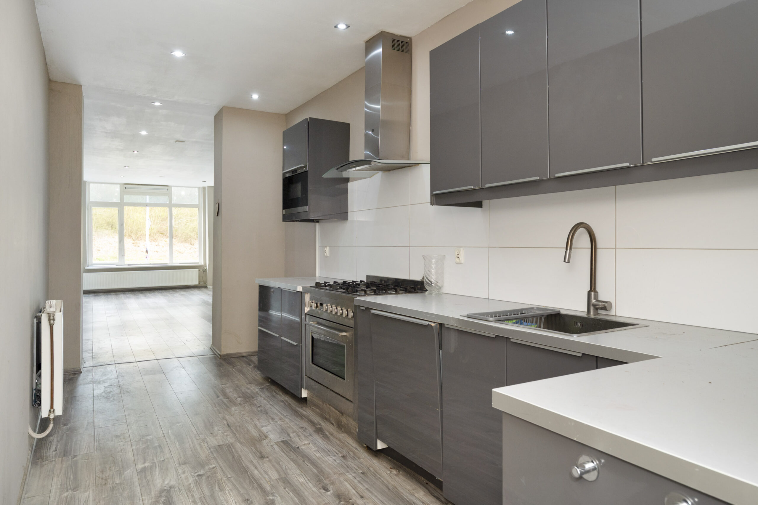 De woonkamer is gelegen aan de voorzijde van de woning en staat door het open karakter in directe verbinding met de achtergelegen keuken. De keukeninstallatie is uitgerust met een afzuiging, een 5-pits gascomfort, een combi-oven en een vaatwasser.