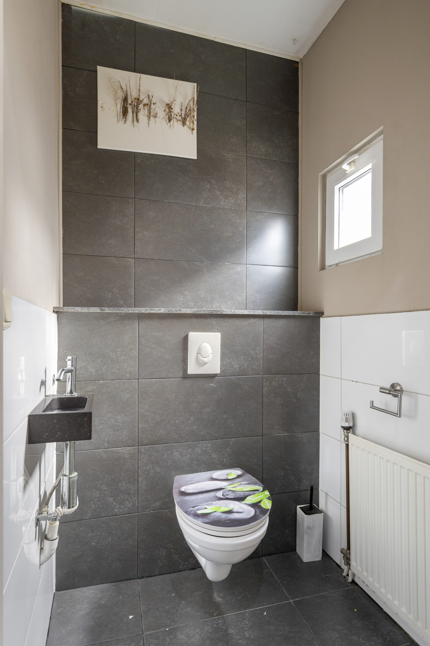 Aan de achterzijde van de woning is er toegang tot het toilet en de tuin. De toiletruimte is volledig betegeld en ingedeeld met een zwevend closet en een fonteintje.